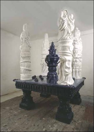 Les sculptures de l’artiste autrichien se présentent, quant à elles, comme d’étranges stalagmites structurées par une architecture construite selon un axe de symétrie centrale — comme les toiles d’Augustin Lesage —, qui rappellent des objets liturgiques, des fontaines ou des architectures religieuses, de facture à la fois gothique et baroque. La matière est très présente et en donnant le relief de la surface vernie, elle engendre des formes, des figures qui, à travers leur caractère anthropomorphe et répétitif laissent deviner des corps, des sexes, des vulves en train de naître de la matière mouvante et de son inépuisable plasticité.