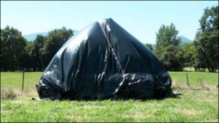 Ou bien, dans Montagne, une meule de foin emballée de plastique noir, un ensilage artisanal, filmé dans la campagne pyrénéenne: le cadre est fixe, neutre (pas trop près, pas trop loin, on pense vraiment à la distance d’un peintre pleinairiste), il fait jour et il fait beau, cette fois — et seul un peu de vent gonfle et dégonfle légèrement la bâche noire, faisant lentement respirer ce monstre.» (Jacques Aumont, «Histoires d’accrochage», Trafic, n°83, septembre 2012.)