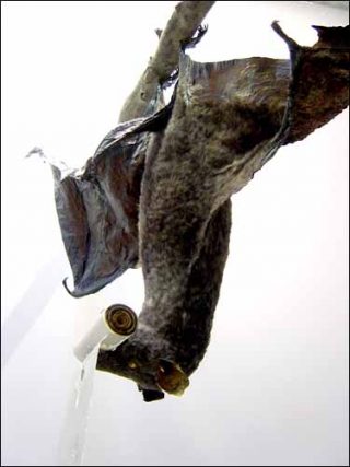 Une chauve souris géante nous tourne le dos. Tête en bas et ailes déployées, elle tient dans sa gueule un rouleau de papier qui se déroule sur le sol de la galerie. Le parchemin est couvert de dessins énigmatiques où s’entremêlent des formes architecturales et des corps presque transparents. Liste des offrandes (2006) donne le ton.