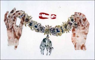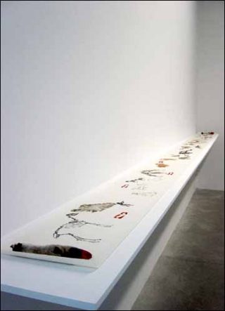 — Moutons ou cerfs, 2006. Aquarelle colorée sur papier de riz et soie, 2 pattes de mouton. 34 x 575 cm.