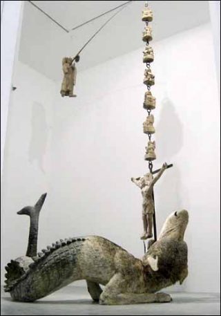 Le métissage culturel trouve sont point d’orgue avec La Pêche. Un animal hybride (mi-loup, mi-poisson) se tord, gueule ouverte. Le monstre chimérique issu des bestiaires médiévaux est hameçonné par une longue chaîne sur laquelle s’agraine un crucifix surmonté de sept bouddhas en bois grossièrement sculptés.