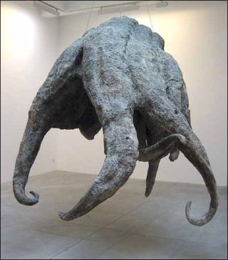 Les Mains de Bouddha procèdent du même genre de confusions culturelles. Échoué sur le sol, ce que l’on identifie au premier abord comme un fossile de poulpe géant tient un chapelet entrelacé dans ses tentacules. Cette pièce monumentale (190 x 470 x 230 cm) invite à une sorte de contemplation par son étrangeté.