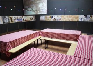 Nous découvrons en effet des tables recouvertes de nappes blanches et rouges à carreaux, avec des verres, des bouteilles de bières et d’eau entamées, des corbeilles à pain, des guirlandes multicolores et une immense marmite, comme si l’on débarquait après le festin de la fête du village.