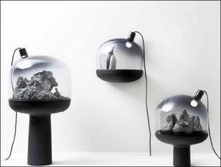 Au croisement du mobilier et de la vitrine, ces luminaires fonctionnent comme de petits cabinets de curiosité qui mettent en lumière l’étrangeté des choses de ce monde. Lorsque la lampe est éteinte, l’ampoule et la douille disparaissent sous l’opacité du verre teinté au noir. Lorsqu’elle est allumée, l’ampoule se dessine progressivement derrière un voile noir dégradé, sans éblouir. Les pieds sont en chêne noirci et les cloches sont en verre soufflé.