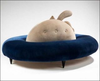 Banquette de milieu Zoïdette, 1994, structure ovale en bois entièrement garnie de mousse recouverte de velours bleu et gris-beige piqué sellier, elle repose sur un piétement tronconique pentapode en bois teinté, l’élément central forme dossier, stylisant un personnage de dessin animé.
