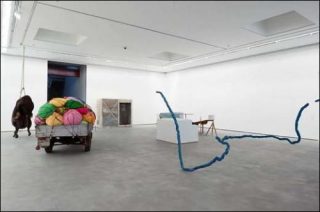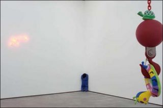 Un animal réduit au plus simple appareil, tel un modelage d’enfant — oreilles, yeux, nez, bouche, anus, sexe, figurés par de simples trous dans la matière creuse — arborant une étonnante expression de stupeur, mais dont le format et le socle produisent une sculpture presque monumentale, cet animal poétique et archétypal créé par Fischli et Weiss est l’œuvre qui ouvre l’exposition.