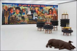 C’est ainsi que de pièce en pièce, de la grève humaine proposée par le collectif Claire Fontaine, clamée par un dispositif de néons inscrivant «Strike» et qui se met en grève en s’éteignant à l’approche des spectateurs, jusqu’au drapeau brûlé laissant apparaître abîmé le mot «Liberty» de Gadar Eide Einarsson, de l’inquiétant intérieur de l’environnement de Grégor Schneider ou plus intime et étrange par son échelle de DeAnna Maganias, du drapeau américain détourné en drapeau pan-africain de David Hammons dont l’œuvre interroge la relation entre origine ethnique, identité et société américaine à la vidéo de Sigalit Landau où nue, elle fait tourner autour de sa taille, devant la Mer Morte, un hula hoop de fils barbelés qui lui entaille la chair, de l’environnement saturé de matériaux pauvres, de textes et d’images allant de la publicité à des images d’une extrême violence de Thomas Hirschorn au regard incisif et ironique que porte Martin Parr sur notre société d’abondance et sur le kitsch à travers ses photographies aux couleurs acidulées, les œuvres développent chacune à leur façon, avec humour ou cynisme, avec critique ou poésie, un point de vue sur les mondes qui construisent notre monde, un point de vue engagé, sans que les œuvres deviennent pour autant de purs discours.