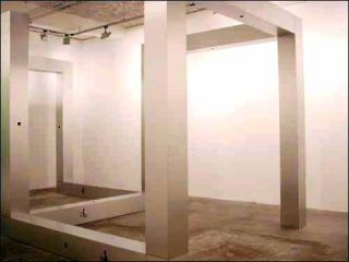 — Lessness, 2003. Installation, bois, plexiglas, haut-parleurs, système audio. 280 x 400 x 40 cm.