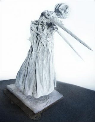 De ses petits êtres de papier, ces silhouettes furtives faites de papier de soie hautes de 15/17 cm, sont ainsi nées cinq figures en bronze de 1,15 m de haut. Le papier a donc été transformé en bronze, et ces sculptures à la patine très blanche ont étonnamment «retenu» l’histoire de papier pour ressembler à des morceaux de cosmos fixés à jamais dans une autre respiration du temps, dans une durée à la fois infinie et indéfinie, telles «des silhouettes destinées à franchir l’idée même de notre temporalité.» Les lignes de visages sont ici prolongées de lignes de «corps drapé intemporel» qui semblent rejoindre l’espace sans jamais se poser sur notre réalité.