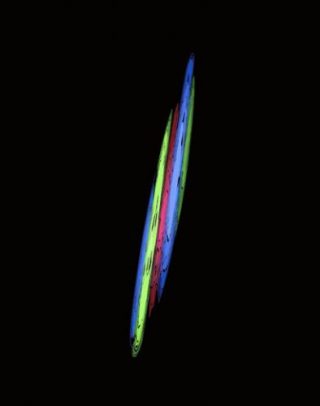 Avant le noir total, la lumière se décompose en couleurs primaires, celles du mélange additif RVB. Intervient ensuite le «dérushage» des vidéos, puis la sélection des images et leur analyse, afin d’en réaliser de grandes peintures.