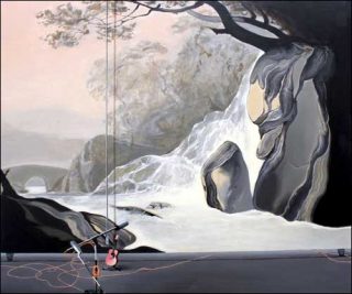 Contrastant avec ces formes légères et fluctuantes, les deux huiles de Simon Willems donnent un autre ton. Sa peinture léchée aux couleurs sombres nous transporte dans un univers étrange aux formes délétères.