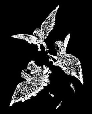 À l’image de Peter Pan, c’est l’enfant qui constitue la menace. Les filles d’Électre, traits ronds et corps monstrueux, survolent les cieux toutes griffes dehors, attentives à l’ici-bas. Elles se sont posées plus loin sur les branches pour compter leur tribut d’âmes. La douceur des pastels pend le long de l’efficacité des serres métalliques des Ravisseuses.