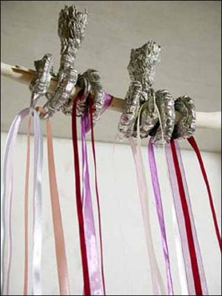 — Serres, détail, 2006. Sculpture anthropomorphique. Etain, branche, ruban de satin.