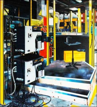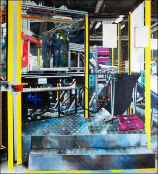 Laurent Proux développe une démarche picturale autour de la représentation de l’espace du travail. Les espaces d’activités du monde industriel sont le support de cette interrogation. D’une part, car ils renvoient aux mutations sociales et économiques qui traversent notre société et, de fait, interrogent la place de l’humain dans un tel arsenal. D’autre part, parce que ce sont des sujets peu communs dans la peinture. Laissés en friche, ils sont des espaces d’exploration propices aux questionnements picturaux.