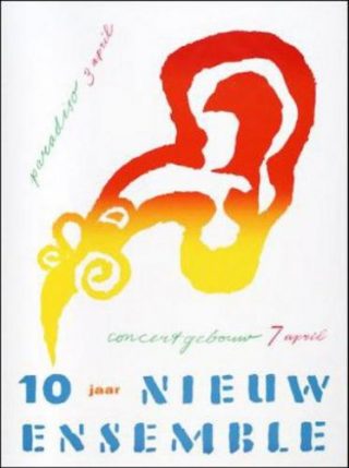Depuis plus de 25 ans, l’artiste a également développé les affiches, programmes et dépliants, du Nieuw Ensemble et de l’Atlas Ensemble, formations de musique classique, dont son fils est le directeur artistique. On y retrouve les caractéristiques du travail de Jan Bons : fond clair, lettrage et images découpés dans des papiers colorés.
