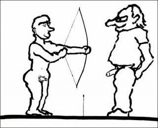 En dehors de deux toiles — Toile, peinture noire et miroir (1963) et Toile de bâche à rayures et châssis bois (1964) —, l’essentiel des travaux présentés à la galerie appartient aux « Calligraphies d’humeur » qui convoquent avec un humour un rien pervers un univers constellé de personnages noir et blanc qui tirent à l’arc à bout portant ou sodomisent un ours, au choix.