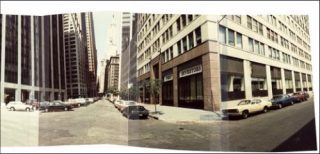 — A panoramic view at Wall & South Streets, New York City, New York. 3 août 1986. 14 x 47 cm