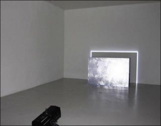Une troisième œuvre trône dans une salle obscure. Cette fois-ci, le projecteur de Michel Verjux, posé au sol, vient frapper de plein fouet un bloc recouvert de graisse noire. La surface exposée à l’éclairage apparaît comme grise, argentée par endroits même. Le rendu est magnifique. Comme toujours chez Michel Verjux, l’éclairage est sciemment élaboré et les effets de cadrage et de focus sont remarquables. Ici, l’éclairage est pensé pour déborder très légèrement du cadre du bloc noir. Ainsi, sur le mur du fond de la pièce, on perçoit certes l’ombre massive du bloc, mais surtout, un mince filet de lumière se détache autour de la masse — comme un filet de lumière passant par le bâillement d’une porte mal fermée, dans une chambre obscure, et nous livrant la clé des songes.