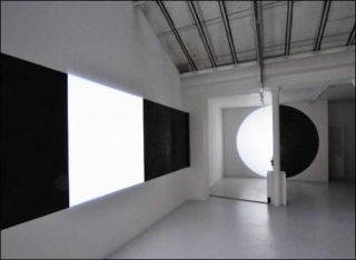 Michel Verjux, quant à lui, a intercalé deux projecteurs qui diffusent deux carrés de lumière incandescente entre les surfaces noires. Le contraste entre les deux procédés est saisissant, passant du noir le plus sombre au blanc le plus éblouissant. Aussi, les surfaces noires et blanches qui se succèdent créent, suivant les termes du philosophe Henri Bergson «une juxtaposition d’unités hétérogènes sur fond neutre».