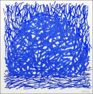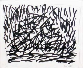 En noir sur une toile blanche, trois zones remplies par les mêmes petits traits, dont seules les inclinaisons varient, composent le sol, la meule et le fond. Le passage d’une zone à l’autre est imperceptible si l’on regarde de trop près, il s’affirme avec le recul. Les innombrables petits segments, qui sont la forme la plus abstraite, la plus minimale, la plus inexpressive que l’on puisse imaginer, apparaissent aussitôt comme autant de fétus de paille joyeusement entremêlés. Ce tableau intitulé Meule, en hommage à Monet retrouve paradoxalement un principe essentiel de l’impressionnisme alors qu’il n’utilise que le trait, et aucune couleur.