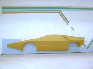 Série dans la série, Carabo Carabo n’est pas la première sculpture de ce type réalisée par Lili Reynaud : il y avait en 2003 la Lancia Stratos Zero Prototype (beaucoup plus bleue métal). Ici, la voiture-sculpture s’accorde aux couleurs pastelles des rayures tennis du wall painting de Fiona Jardine, lesquelles encadrent des jambes au galbe standard (sexy mais standard) se dirigeant de façon déterminée hors du figuratif…