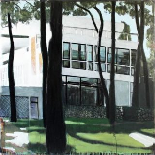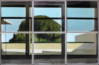 La pièce maîtresse de l’exposition — Paysage N°110, un monumental polyptique composé de six panneaux carrés —, est un point de vue depuis l’intérieur d’une architecture, pris à travers une grande baie vitrée ouvrant sur une savante géométrie d’ombres. Le point de vue est donc ici inversé: ce n’est plus celui du promeneur décidant de s’arrêter sur telle façade d’immeuble qui est privilégié, mais c’est bien celui de l’occupant, de l’homme de l’intérieur qui regarde au dehors. Le tableau retrouve sa nature classique, albertienne, de «fenêtre ouverte sur le monde», mais c’est maintenant le monde qui pose problème. Puisqu’ici, la fenêtre ouvre sur une perspective fermée, bouchée par la masse chaotique d’un arbre étrangement touffu: le monde est désormais inquiet, ralenti dans sa course, il n’est plus un Tout. C’est depuis l’intérieur de la Villa Noailles (chef d’œuvre moderniste signé Mallet-Stevens) que l’artiste a pris la photo qui allait lui servir de modèle; ce détail a son importance puisqu’il nous rappelle l’intérêt que Jérémy Liron porte à ces architectures blanches, sans fioritures, tels des cubes flottants dans le paysage, qui semblent avoir été désertées, de toute éternité.