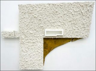 De la même façon qu’il existe un abysse entre les maisons modèles d’architectes du programme et la réalité pavillonnaire telle qu’elle s’étale désormais en banlieue de nos villes, Wilfrid Almendra réinterprète dans sa série de dix sculptures murales, Killed in Action (2009), autant de maisons qui sont restées à l’état de projet, en imaginant, à coup de techniques de bricolage, de matériaux de récupération chargés d’histoires et de références autobiographiques, leur devenir si d’aventure elles avaient été construites.