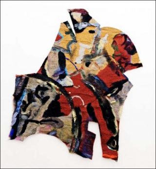 La peinture de Rebecca Brewer exprime, à la limite de la figuration et de l’abstraction, avec des moyens de la modernité, un rapport au sauvage, incarnant peut-être une figure pré-historique du peintre. Cette grande pièce de feutre sur laquelle elle a peint, le pigment accrochant difficilement le matériau laineux, fait penser par sa forme aux esquisses de la grotte de Pech-Merle, et à ces expérimentations que l’on fait enfant, sans avoir acquis le savoir-faire technique de l’art. Assumer ces tentatives expressives, plutôt que contrôler l’expression par des formes admises, est la grande force de Rebecca Brewer.