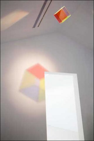 Lionel Estève. Son titre est Liquide jaune lumineux. C’est une pièce minimale. C’est une sculpture qui est actionnée par un petit moteur. Ce cerceau dans l’espace créée une illusion. C’est presque un hologramme.