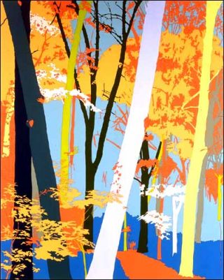 Lisa Ruyter donne à ses forêts une puissance affective par la composition d’espaces hostiles ou bien ouverts au regard, denses ou aériens et que soulignent les contrastes colorés, joyeux ou dramatiques. The Last Hole, seul tableau horizontal de la série, place notre regard à la hauteur des cimes. Des feuilles de couleurs vives se détachent sur le ciel d’un bleu intense, balayées par le vent. Blind Corner séduit par son caractère épuré aux réminiscences japonaises. La luminosité des couleurs et cette nuée de feuilles blanches flottant comme des oiseaux dans le bleu du ciel, la composition calme et équilibrée rappellent aussi les derniers travaux en papiers découpés d’Henri Matisse.