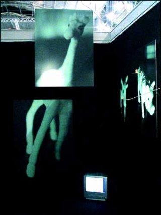 L. V. L. L’installation vidéo, appelée Vidéothèque, est composée de douze cassettes-sculptures. Le principe est que l’image projetée à l’écran correspond à un film de l’objet-cassette visionné, dans lequel sont intégrés des animaux et objets divers. C’est un groupe de onze moniteurs de petites tailles (12/15 pouces) disposés dans le même espace commun, comme dans un zoo. Les moniteurs sont suffisamment petits pour que l’on doive s’approcher de très près pour voir clairement l’image projetée. Ils sont disposés de façon à ce que l’on ne puisse pas regarder plusieurs moniteurs en même temps, obligeant ainsi le spectateur à parcourir individuellement les « cages ». La perception totale du groupe nous laisse deviner qu’il y a des choses en mouvement, sans pouvoir arriver plus loin. Par contre, on entend le bruit de chacune de ces cages. Les sons et les rythmes différents, qui se mélangent, forment un son général commun, qui s’individualise aussi lorsque l’on s’approche.