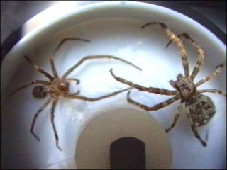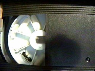 K. G. Vous présentez également une vidéo, qui fait partie d‘un ensemble de douze films et cassettes. On voit un objet rond en plastique blanc avec des compartiments. Cet objet effectue une rotation lente en avant et en arrière. Dans chaque compartiment se trouve une araignée morte. Il s’agit en fait d’une cassette vidéo que vous avez ouverte et filmée pendant la lecture dans le magnétoscope, après y avoir introduit les araignées. Cette « cassette préparée », qui est dans le magnétoscope de votre espace au Salon de la Jeune Création, est celle sur laquelle est enregistrée son image. Le spectateur voit donc sur l’écran ce qui est « physiquement » dans le magnétoscope. En plein dans ces questions de contenu et contenant, de surface et d’écran, n’attirez-vous pas à coup sûr l’attention dans les profondeurs du mécanisme ?