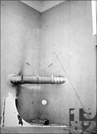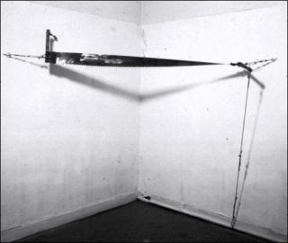L’installation Bois représente l’obstacle en lignes sobres sous la forme d’une scie aux dents pointues suspendue à l’angle d’un mur et soutenue par un câble fixé à une plinthe. La scie élancée et son ombre portée évoquent un arc tendu et une férocité chuchotée.