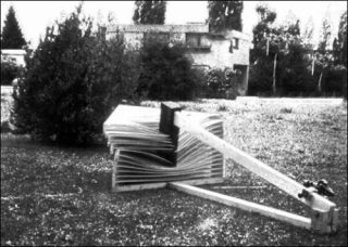L’obstacle horizontal se fait parfois plus complexe dans l’œuvre de Patrick Michault. Sa ligne caractéristique se dédouble pour former une pince prolongée d’un marteau dans l’installation en bois et acier intitulée North wind. Cette pince cherche à comprimer des casiers de bois serrés, à ne faire qu’une ligne autoritaire d’un éventail aéré d’espaces.