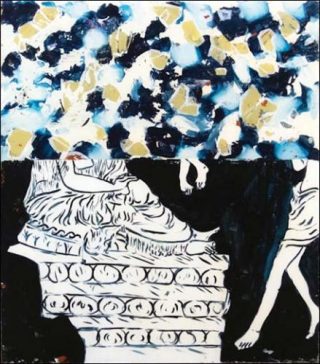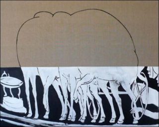 Ainsi dans les tableaux Les oxydations du monde et A Grotesque Story, des dessins empruntés à l’imagerie de l’antiquité grecque sont coupés horizontalement. Dans le premier, la partie supérieure est remplacée par des taches de couleurs abstraites tandis que dans le second, un simple tracé s’y substitue, prolongeant les contours de l’image originelle tronquée, de façon à transformer et détourner ce qu’elle représente. Ailleurs, une statuette d’Honoré de Balzac côtoie une céramique péruvienne du IVème siècle et un schéma d’utérus du moyen âge; un moule à gâteau bleu sert de support à un modèle de coiffure en noir et blanc.