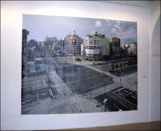 Sur un format de 2,80 x 3,50m, on aperçoit les carrefours immenses d’une mégapole vide d’êtres humains. Seuls décors : les panneaux et les objets publicitaires, dont l’un, particulièrement grotesque, figure une immense basket au sommet d’un building. La ville de Guan Ming Yuan est imaginaire, avec un seul indice : l’écriture en japonais des publicités.