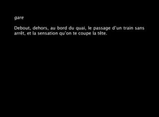 C’est un projet que j’ai commencé en 2004. L’ensemble exposé est la version la plus récente à ce jour, avec 136 textes d’un projet en cours. Chaque texte décrit une situation miraculeuse, un comportement habituel, un souvenir, un état, en mémoire ou décrit sur l’instant. Chaque texte comporte un titre, et demeure en même temps autonome et partie constituante d’un tout. Cette présentation de longue durée sur écran apparaît sans début ni fin, et s’adresse, à la différence des installations sonores qui requièrent un auditeur mobile, à un lecteur immobile, assis sur un banc.