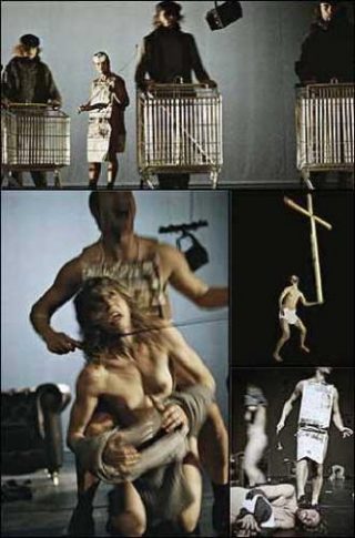 Ironiquement, le réconfort vient de caddies qui organisent un ballet sur Le Beau Danube bleu et dissimulent la violence pour un temps. Jésus Christ ne porte plus sa croix. Il déambule aveugle à l’agitation du monde, rendu incapable de racheter quelque péché que ce soit tandis que le sofa sait offrir un refuge temporaire. Son confort encourage à tout accepter, actes et paroles, et amplifie jusqu’à la boursouflure l’immonde tolérance. Pleine d’adoration, une femme s’accouple à lui, espérant que son sac à main lui donne des bébés.