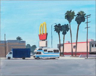 Les peintures à l’huile de l’artiste représentent donc des moments fugaces, croisés au détour d’une rue, alors qu’il parcourait Los Angeles en voiture. Il a d’abord capturé ces instants sur le vif avec un appareil photo, avant de les retravailler à la peinture. Sans aucun croquis préalable, il fait apparaître ces scènes sur le canevas, à l’aide de touches de pinceaux visibles, tantôt fines – pour les lampadaires longilignes, tantôt larges – pour les étendues parallèles de ciel et de route. Ces tableaux de petit format figent ainsi à jamais des aperçus éphémères de la côte ouest des États-Unis au XXIe siècle.