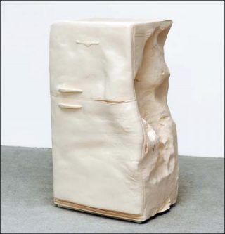 La couleur jaunâtre de Butter (un réfrigérateur) et le blanc crémeux de Body (un distributeur de lait pour le corps) révèlent à la surface ce qui serait normalement le contenu de l’objet. L’intérieur et l’extérieur, l’enveloppe des choses en tant que pars pro toto sont des thèmes récurrents dans l’œuvre d’Erwin Wurm. Par le passé, l’artiste a déjà habillé des socles de sculptures comme des personnes.