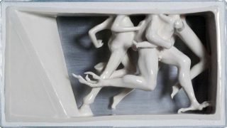 Les œuvres de Louise Hindsgavl, pièces en porcelaine blanches formant des scènes et des personnages, associent la noblesse naturelle de ce matériau a des représentations dérangeantes. La série Misplacement est composée de différentes scènes réalisées en porcelaine émaillée et entourées d’un cadre en aluminium brossé. Dans Misplacement #2, trois personnages dansent en formant un cercle dans une structure verticale en forme de T, elle aussi en porcelaine. Les personnages ont des attributs animaliers tels que des bras et des têtes d’ours ou des pattes de chèvres, mais une posture humaine. Une dichotomie que l’on retrouve dans Misplacement #4, où sont visibles trois corps en train de courir, enserrés dans un cadre en porcelaine de telle façon que leur tête est tronquée. L’apparence générale de chacun d’eux est humaine mais elle est perturbée par des détails anatomiques relevant d’autres espèces : des griffes de poulet, des sabots de cheval ou une fourrure animale.