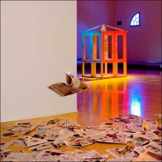 Entourée d’une tuyauterie, diffusant l’air extérieur à l’intérieur de la salle, comme pour donner «l’air du temps», l’espace quasi vide de L’Ouverture est parsemé d’une multitude d’hebdomadaires du monde entier, déposés chaque semaine au centre de l’espace et effeuillés par la ventilation.