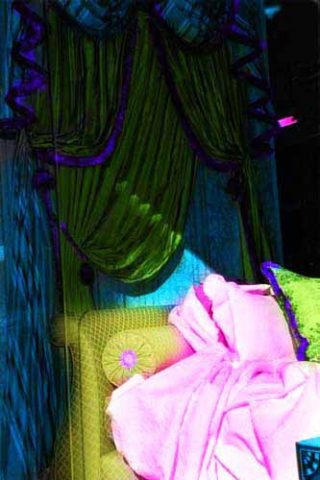 Cette pièce de Martine Aballéa inspire une rêverie colorée, lumineuse, auratique peut-être (rose, jaune fluo, violet, vert…). Le visiteur peut s’allonger dans le lit à deux places, rester là , dans une solitude voulue ou dans un échange possible.