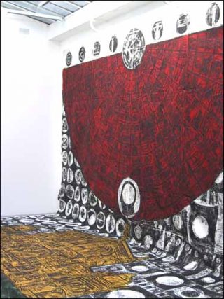 A l’étage de la galerie, on découvre l’installation de grandes feuilles de papier où l’artiste a inscrit et dessiné à l’encre noire tout ce qui lui venait à l’esprit au sortir d’une séance d’hypnose. Dans ce moment-là , amour, travail, vérité et beauté sont quatre notions vitales qui ressurgissent et prennent toute leur importance.