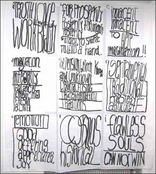 On trouvera en début d’exposition un exemple récent de ce travail avec Evolving Chart Prints. Cette cosmologie de 48 dessins combine une série de signes graphiques auxquels l’artiste associe un langage de couleurs qui repose sur cinq notions fondamentales : le vert évoque la nature, le rouge le subjectif, le jaune les arts et les sciences, le bleu la vie quotidienne, le noir et blanc étant réservés aux signes et au langage.