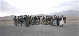 Quel sens, en effet, peut véhiculer une photographie panoramique d’un homme gisant à terre, un taliban, tué au cours de bombardements, ou bien la photographie montrant dans un large paysage montagneux, sur une route, un groupe d’Afghans veillant leurs morts ensanglantés, étendus à leurs pieds? Le sens d’une dénonciation ou celui d’une énonciation? S’agit-il encore de témoignage ou bien d’une esthétisation de la brutalité du réel, d’images d’actualité sophistiquées ou bien d’une forme nouvelle de la peinture d’histoire?