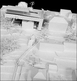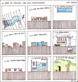Luca Merlini. J’ai fait ce projet en réponse à la question de l’exposition «J’aimerais» à la Villa Noailles. C’est un projet que j’ai imaginé spécifiquement pour l’exposition. La notion de dérive est présente. L’école devient même un lieu de dérive. Le Début de l’archipel se compose d’une série de traversées: traverser la ville, traverser les murs, traverser le «grand bordel» (en italien c’est plus élégant: «Il gran casino»), traverser des paysages. L’enjeu étant d’articuler et rassembler les morceaux rencontrés dans ces traversées, dans cette dérive. A la fin, on trouve une Villa Savoye — villa emblématique de Le Corbusier — à l’envers qui sert d’appui à un porte-à -faux trop grand… On trouve aussi un lieu où l’on jette les maquettes accumulées, et toute une série d’idées, un peu inachevées, de cet ordre. Dont la dérive.