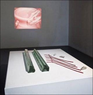 L’installation Renegotiate associe film et sculpture. Lucy Skaer réduit à une seule longue scène le film muet d’avant-garde Borderline tourné en 1930 par le Pool Group, composé de la poétesse Hilda Doolittle (dite H.D.), du cinéaste Kenneth Macpherson et de la romancière Winifred Bryher. Dans cette scène de tension entre deux personnages, l’artiste insère une forme abstraite mouvante en perforant les photogrammes avec un instrument utilisé autrefois par les poinçonneurs dans les gares. Des sculptures en verre répliquent l’image du poinçon qui défile en boucle, en bousculant la perception des formes et la logique narrative.