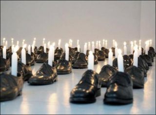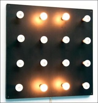 Voici d’éphémères, délicates et fragiles bougies installées dans des chaussures avec un certain sourire et des regards en coin vers Magritte par Erik Dietman ici, là les éblouissants éclats d’Ann Veronica Janssens qui provoquent vertiges et pertes de repère. Voici les lueurs assourdies d’une ampoule que Sophie Dubosc saisit dans du ciment ici, là l’ivresse hurlante des néons d’Andrea Nacciarriti, empilés dans un caisson à côté de la vidéo de Jean-Claude Ruggirello qui nous montre, selon un mouvement horizontal impavide, de multiples couchers de soleil en suspens.