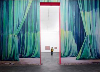 — Nina Childress, Rideau vert, 2015. Wall painting, 300 x 400 cm. Exposition «Magenta» au Crac LR.